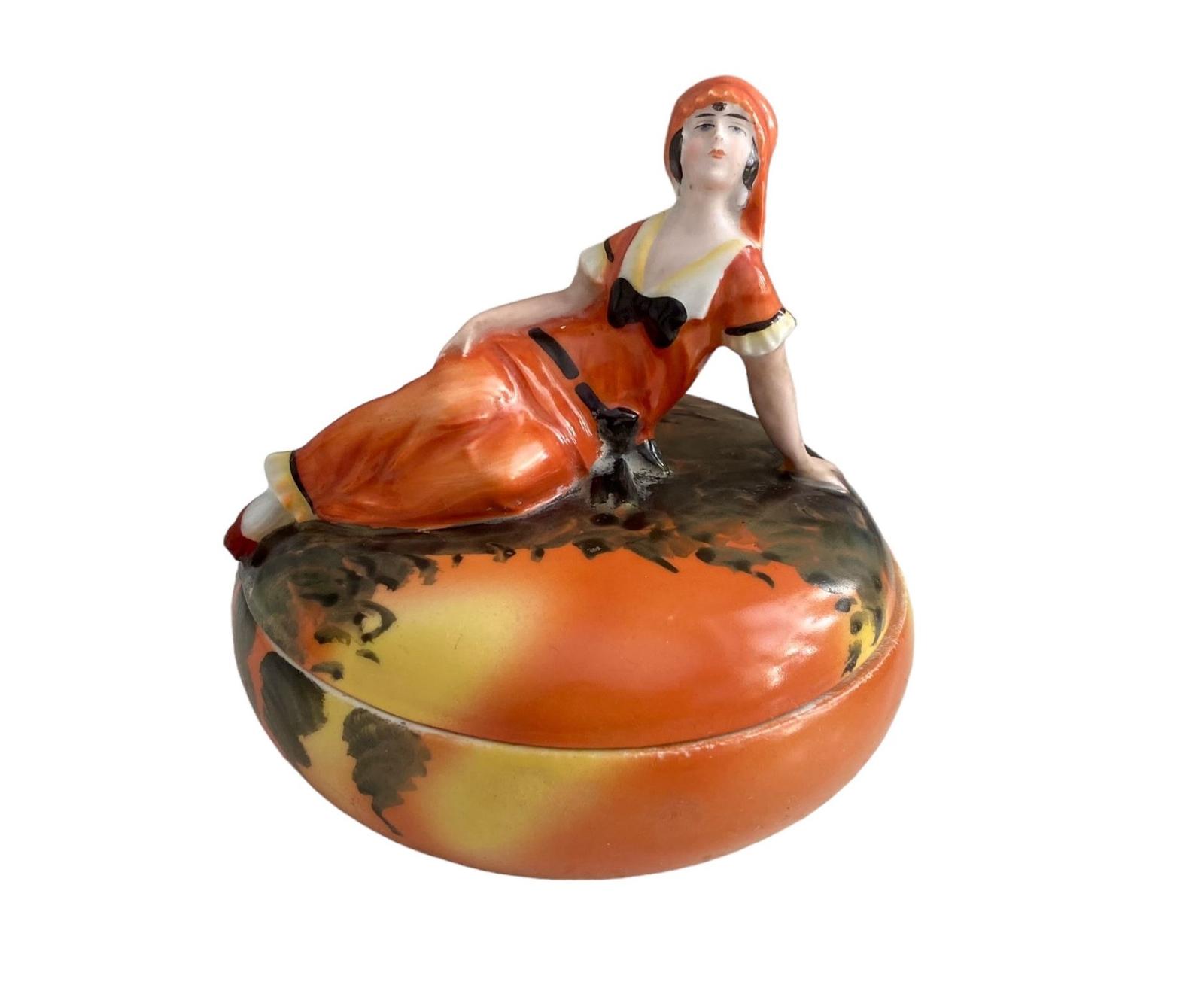 Art Deco Figural Dressing Table Trinket / Powder Pot Box German Porcelain with Flapper Lady Circa 1920