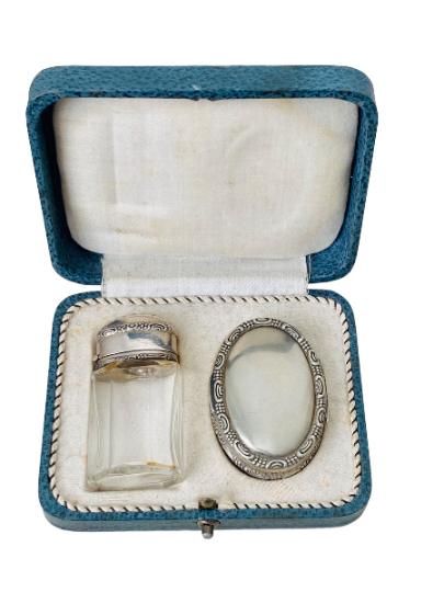 Art Deco French Cased Alpaca Perfume Scent Bottle & Powder Compact Set Circa 1920