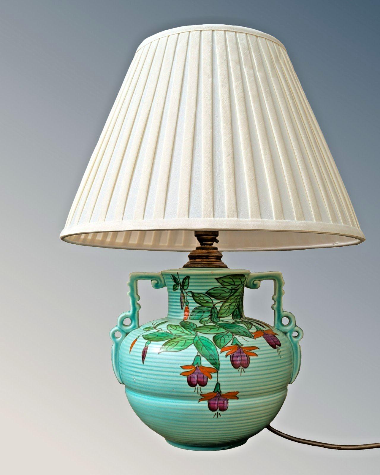 A lovely art deco table lamp by Royal Cauldon in perfect working order, complete with a silk coolie style pleated shade. The pretty lamp is hand painted with fuchsias and has a lovely deco shape. The lamp measures 50 cms high overall. The shade is 36 cms in diameter. UK delivery is £15.