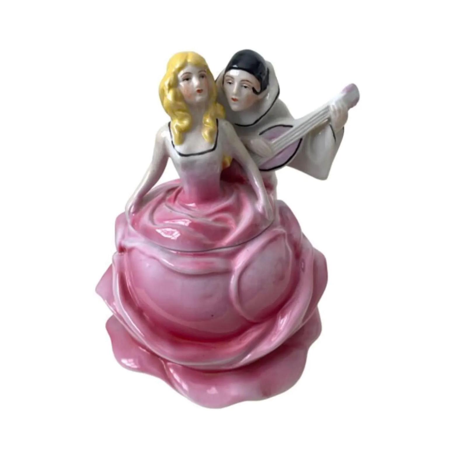 Art Deco German Porcelain Carl Schneider Figural Pierrot & Colombine Dressing Table Trinket / Powder Pot Box c.1930