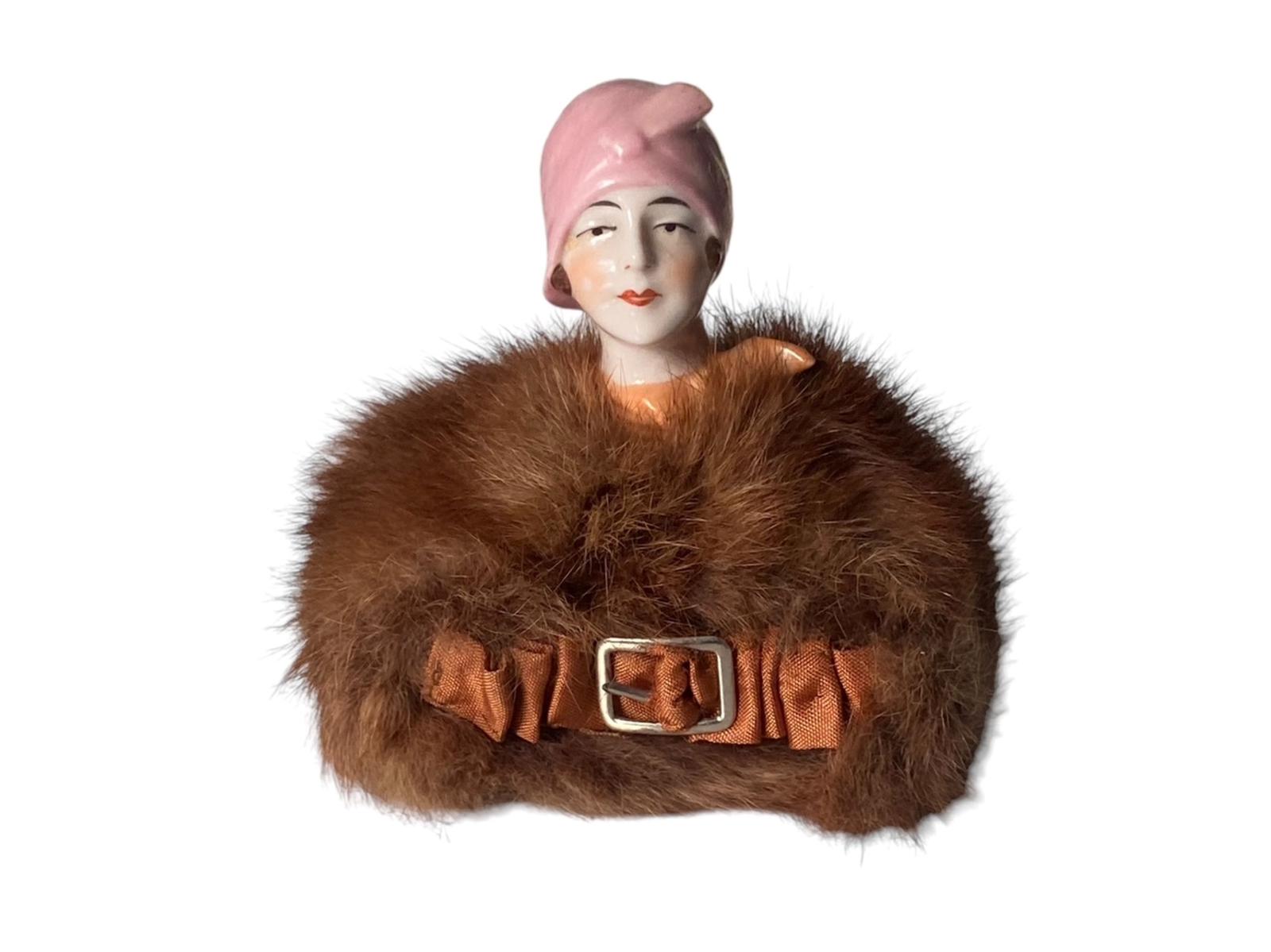 Art Deco German Porcelain Fasold & Stauch Flapper Lady Half Doll Head Pin Cushion Ensemble