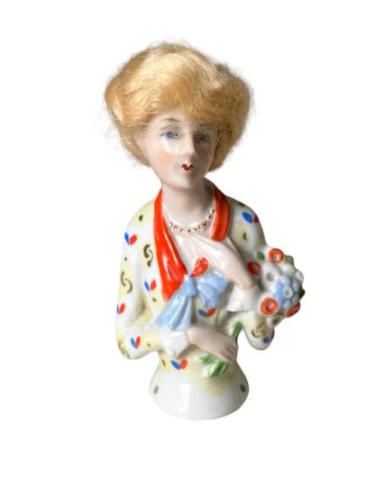 Art Deco German Porcelain Flapper Lady with Mohair Wig Pin Cushion Half Doll