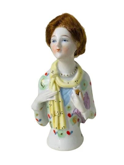 Art Deco German Porcelain Flapper Lady with Mohair Wig Pin Cushion Half Doll
