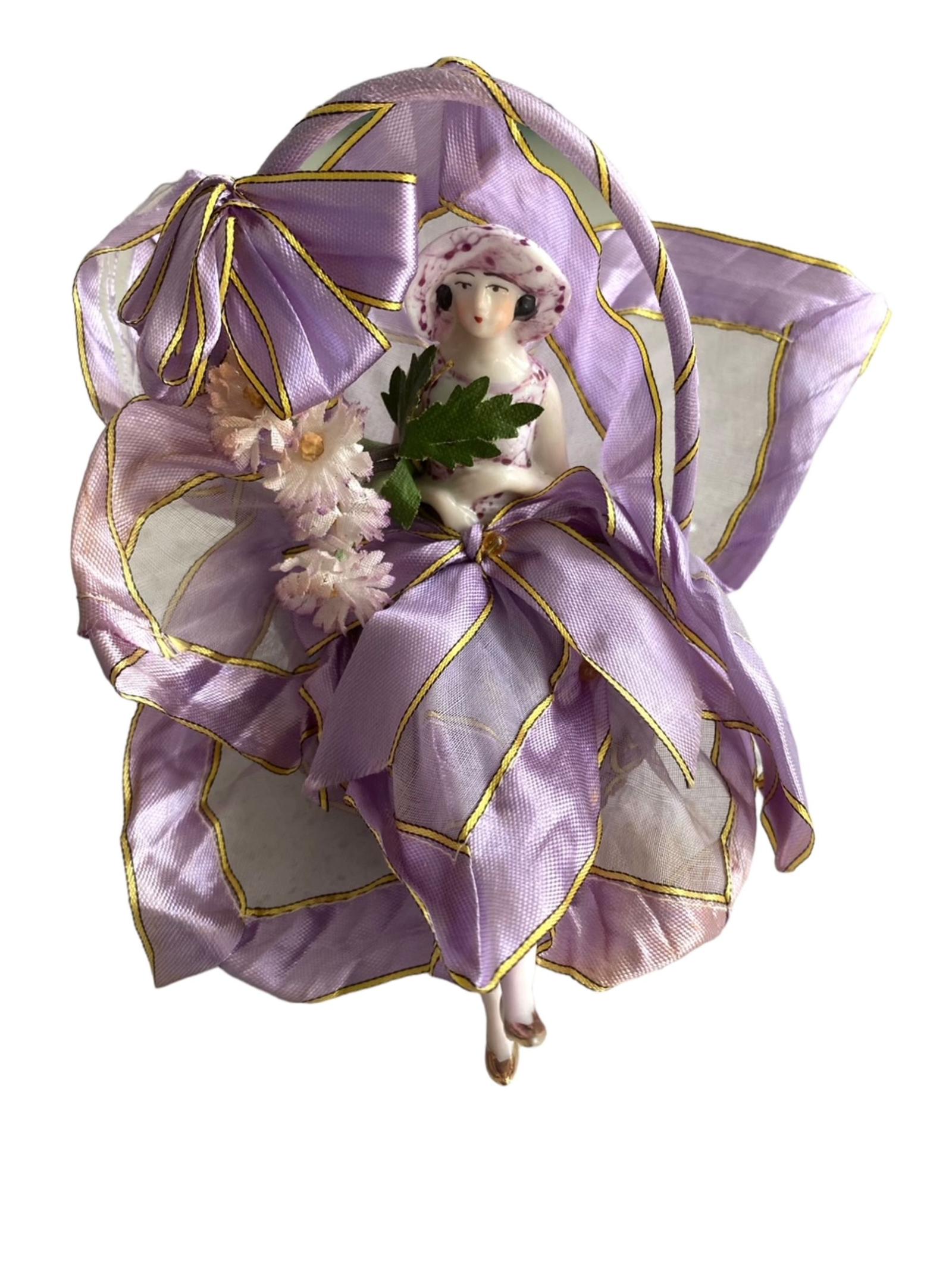 Art Deco German Porcelain Lustre Glaze Flapper Lady Half Doll on Pin Cushion with Legs and Original Silk Clothing