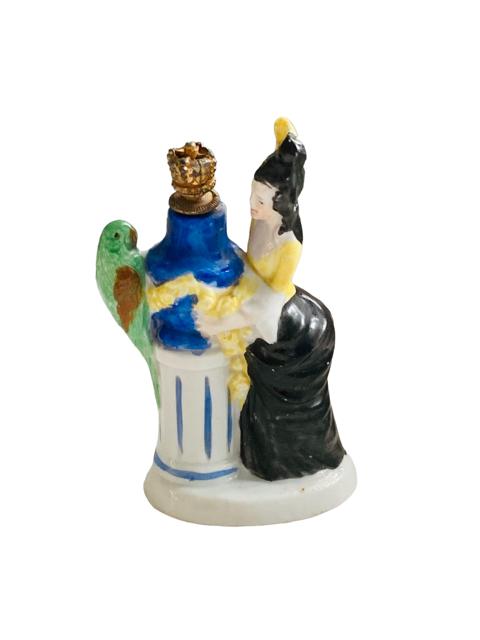 Art Deco German Porcelain Sitzendorf Lady with Parrot & Urn Figural Crown Top Perfume Scent Bottle c.1930
