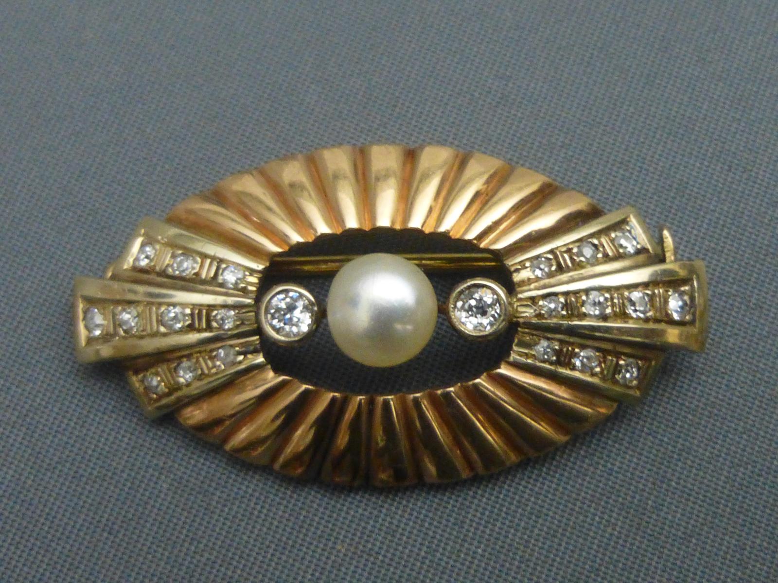 Art Deco Gold, Diamond & Button Pearl Brooch