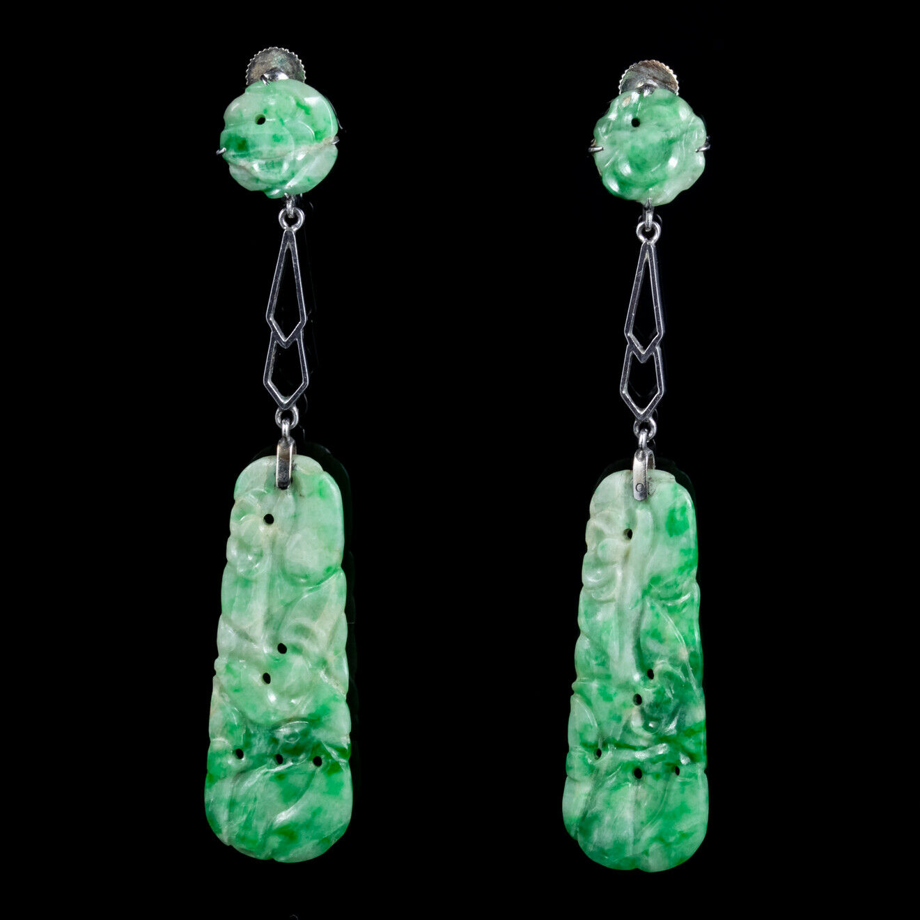Art Deco Jade Drop Earrings 9ct White Gold c.1920