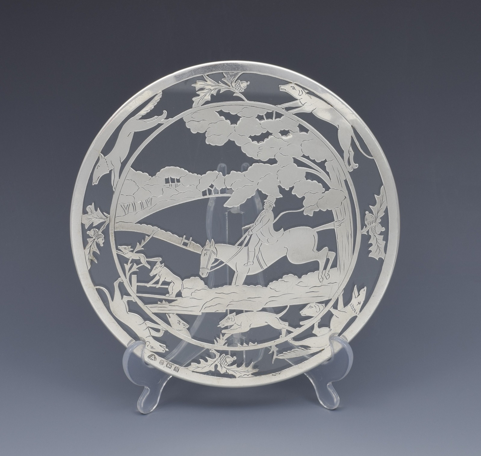 Art Deco Novelty Silver & Glass Teapot Stand Horse & Hounds Fox Hunting