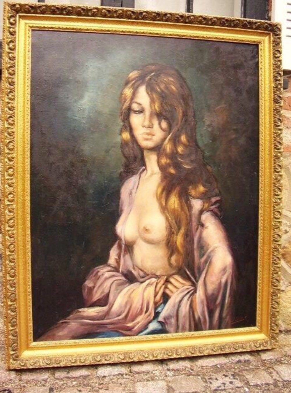 Art Deco Oil On Canvas Portrait of Semi-Nude Lady in Moonlight Pose