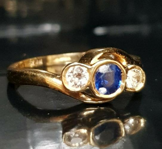 Art Deco Old Mine Cut Sapphire & Diamond Trilogy on 18ct Gold Ring