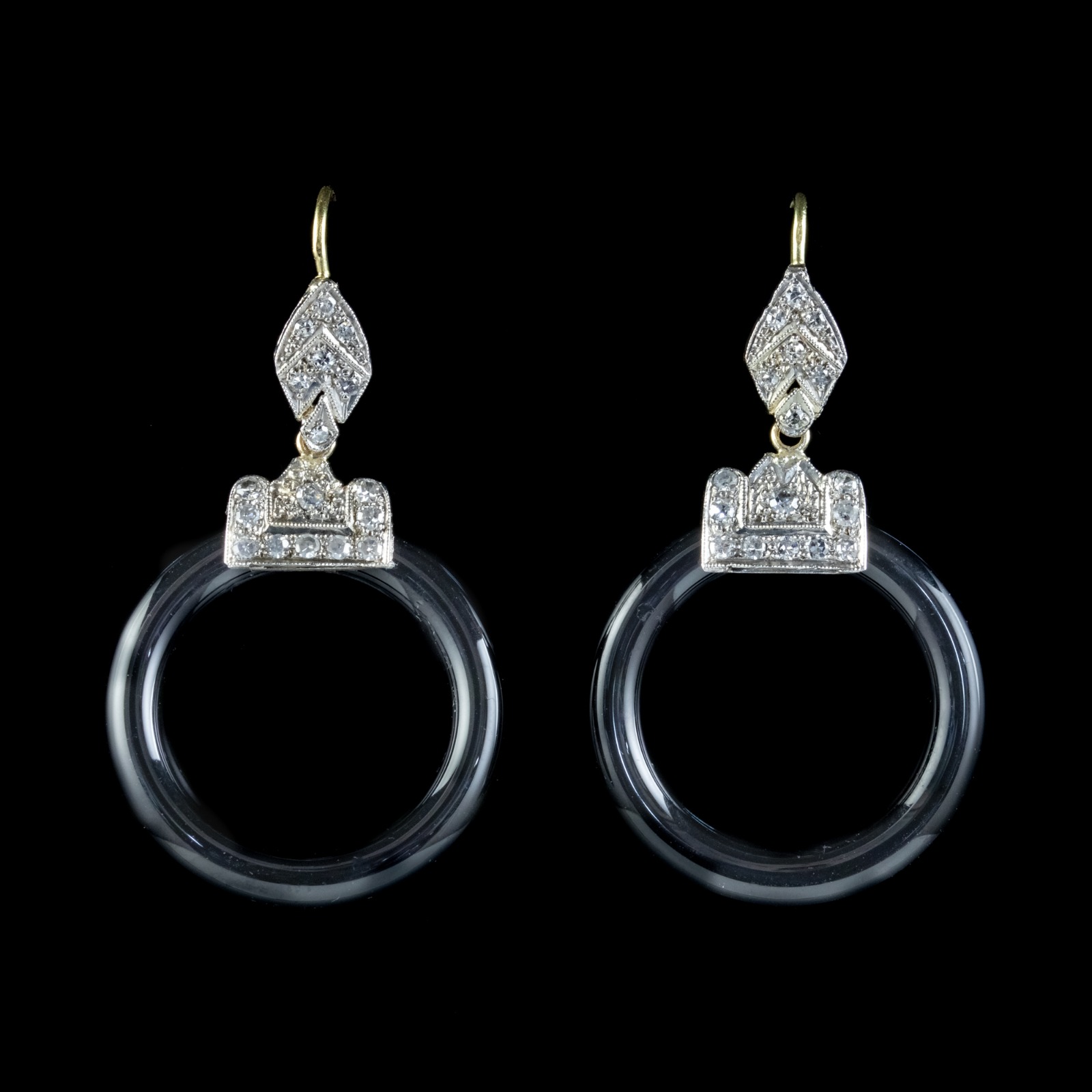 Art Deco Onyx Diamond Hoop Earrings 18ct Gold Platinum c.1920