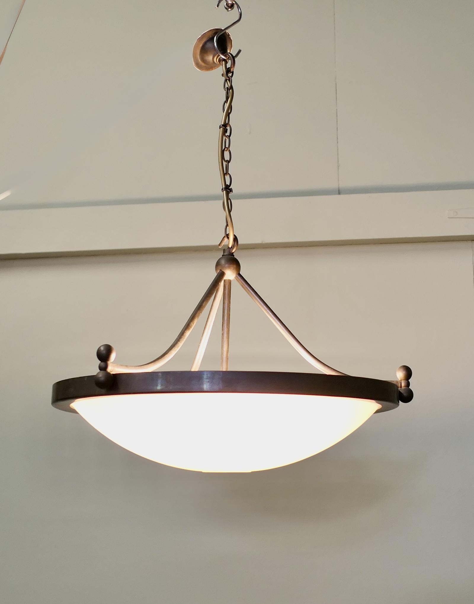 An excellent quality piece, the light frame is made in age darkened brass, the light frame hangs on a chain it hangs 22” from the ceiling and is 16” in diameter