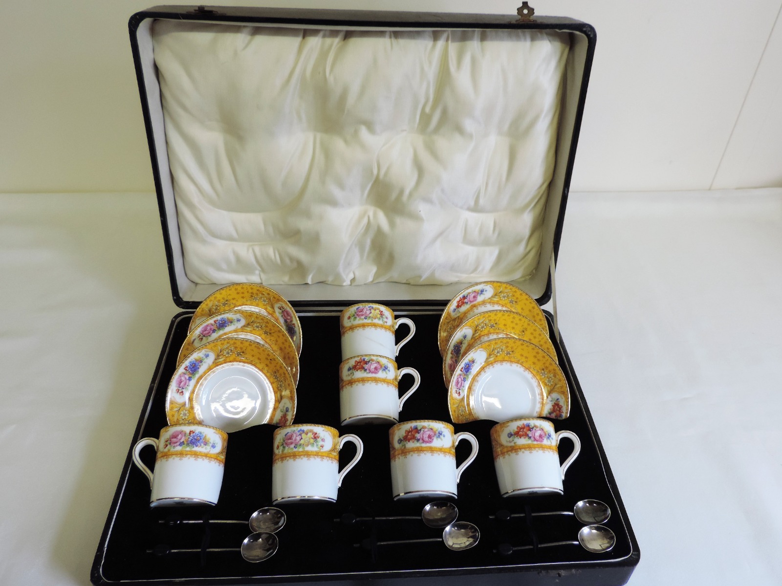 Art Deco Paragon Porcelain Coffee Set with 6 Silver Spoons Rockingham Yellow