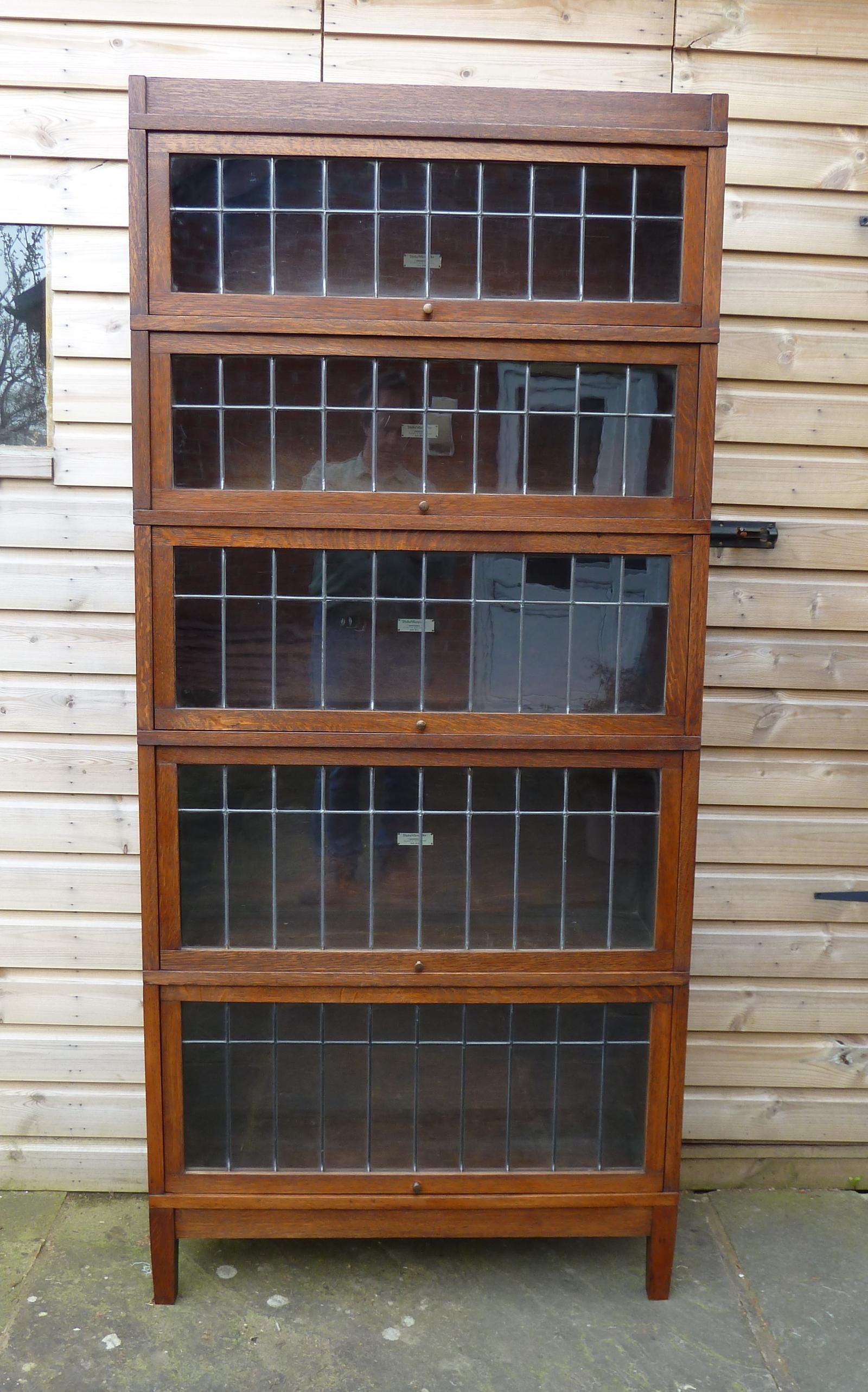 Offered for sale is this golden oak Art Deco Globe Wernicke 5 section stacking bookcase (circa 1925-1930. All the doors work well and the handles are present. 4 of the sections have the Globe Wernicke labels and the condition of the bookcase is very good.