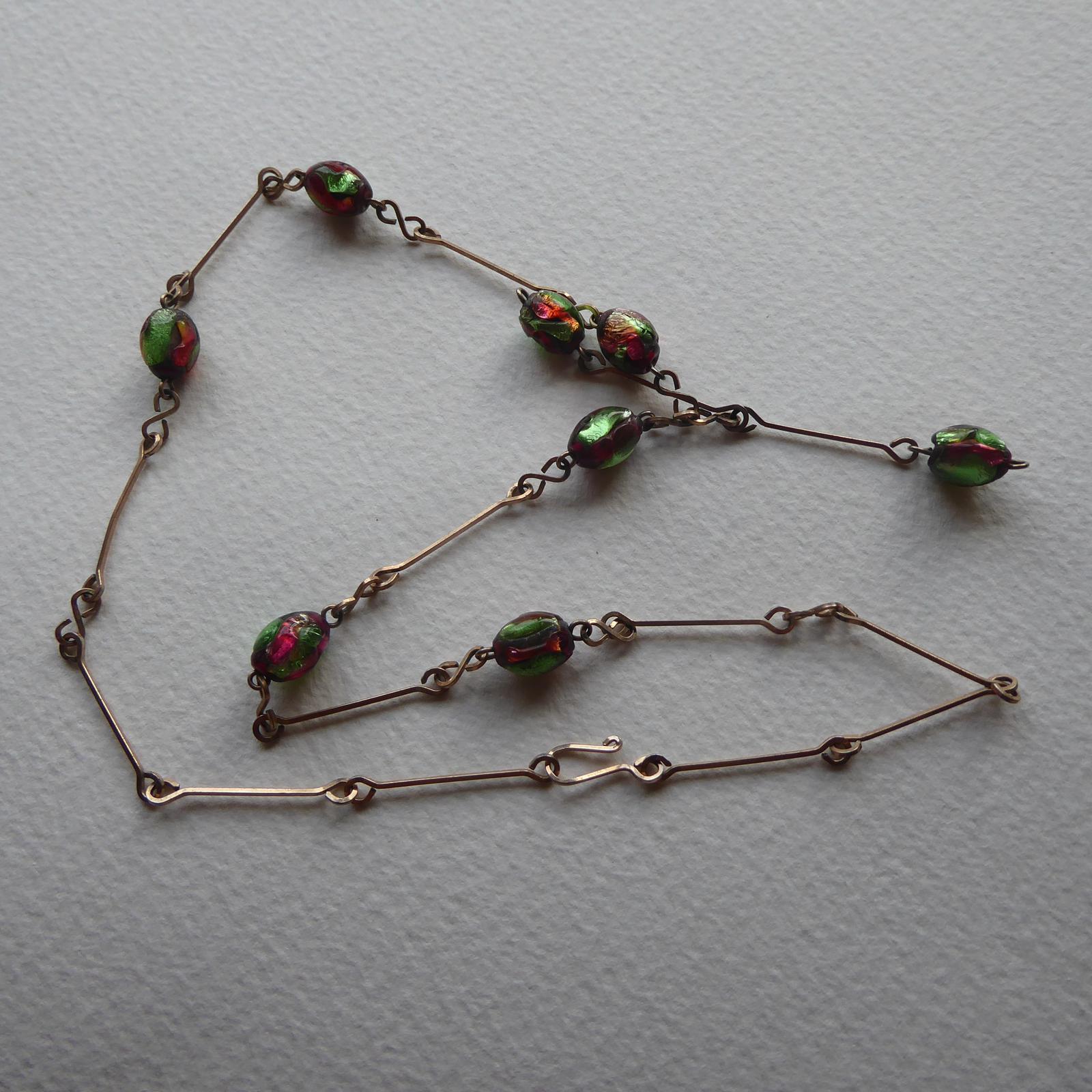 Art Deco Pink & Green Foil Glass Bead Necklace