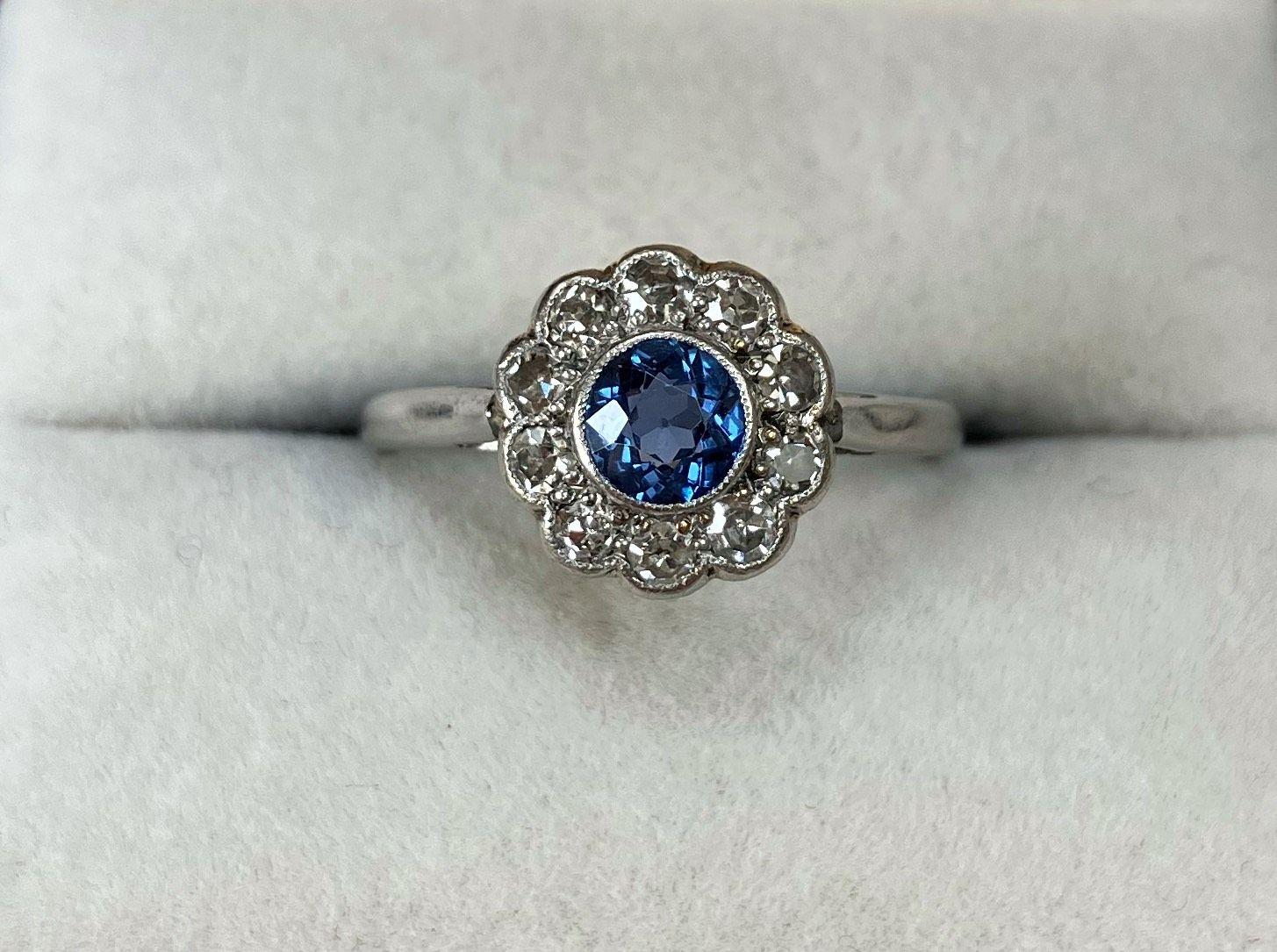Art Deco Platinum Sapphire & Diamond Flower Cluster Ring