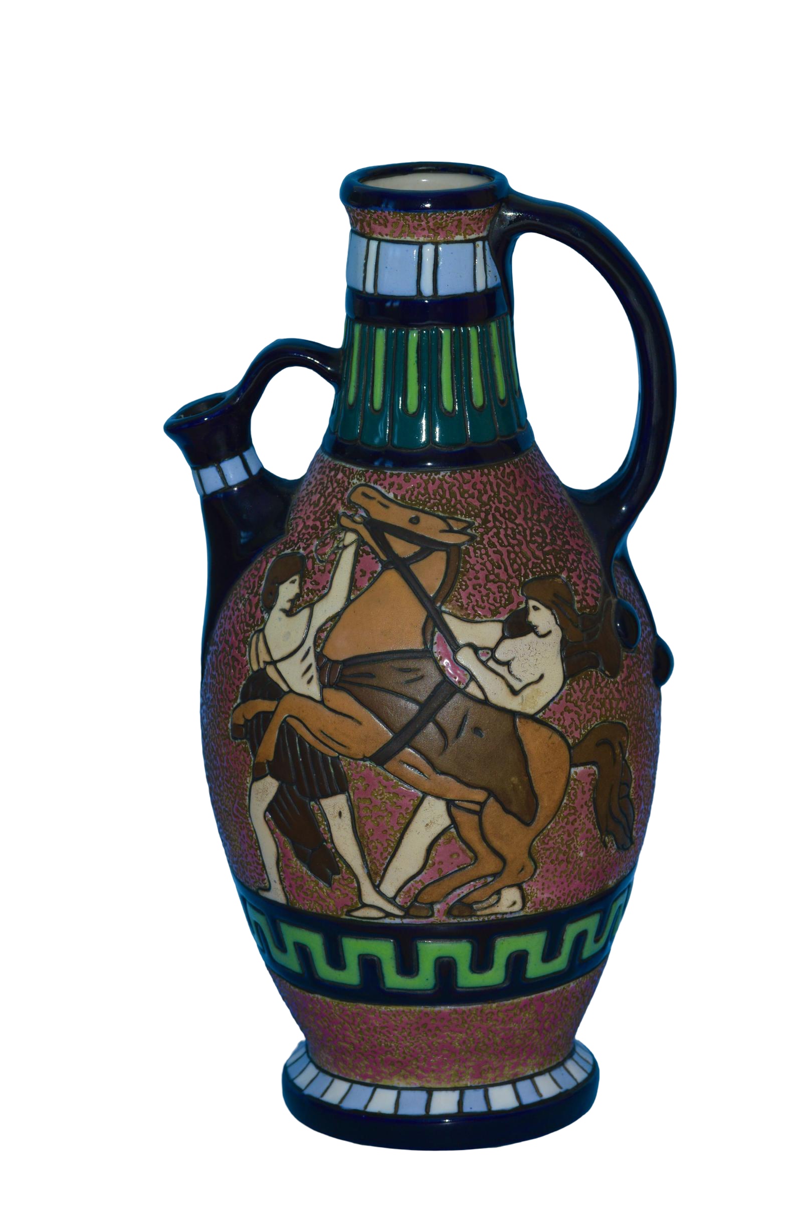 Superb and substantial polychrome ceramic pitcher of the famous Amphora brand.