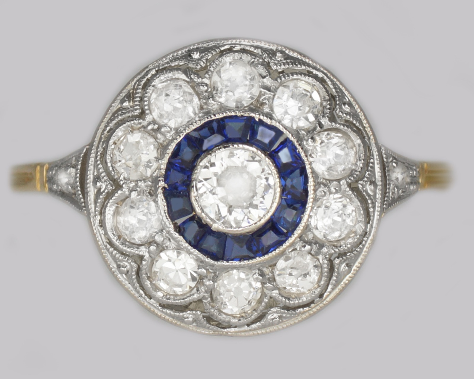 Art Deco Sapphire & Diamond Target Ring Antique 1920s 18ct Gold Cluster Ring