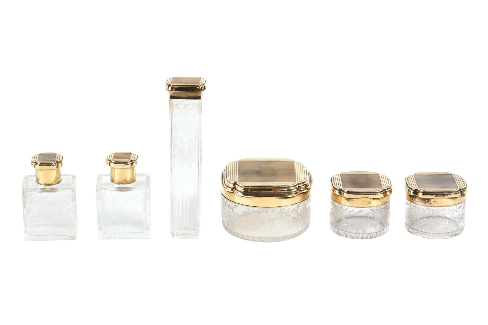Art Deco Set 6 Etch Glass & Silver Gilt Dressing Case Bottles