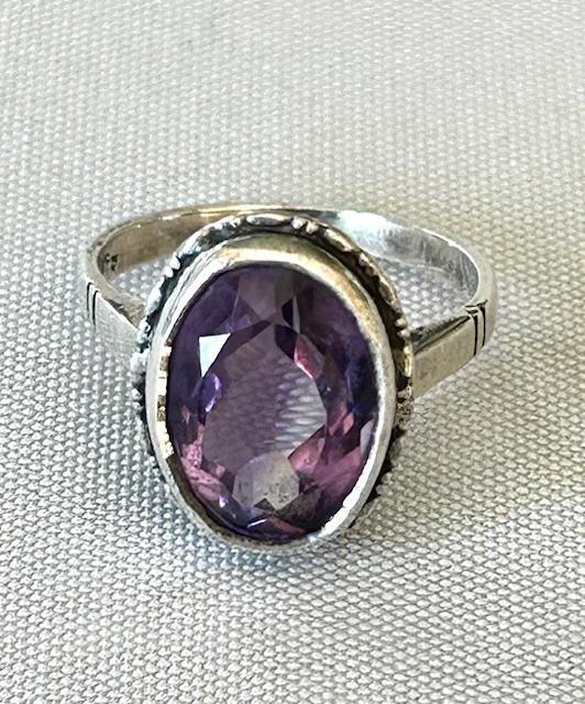 A gorgeous silver ring dating from the Art Deco period. The ring features an impressive cushion cut oval amethyst, in a bezel setting. The ring is a lovely example, marked 'silver' inside the band and is size N1/2.