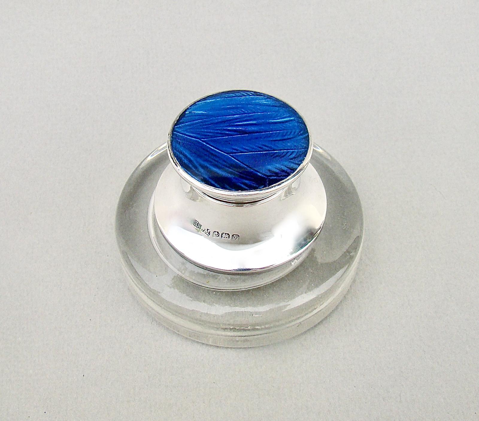 Art Deco Silver & "Butterfly Wing" Small Glass Inkwell by Henry Matthews, Birmingham 1923