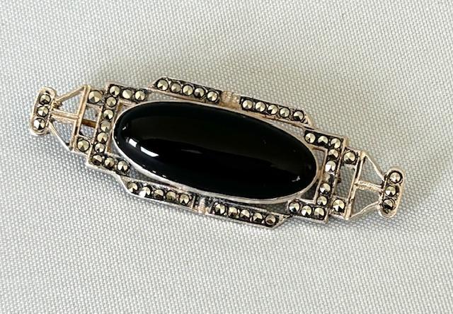 A stylish silver brooch, dating from the Art Deco era. This elegant example has the popular design motifs of the era, including parallels and geometric lines. The brooch is set with marcasites and has a central bezel set oval cabochon of black onyx. To the back, the pin is secured by a 'c' clasp and although unmarked, the brooch tests as silver. A lovely period example, so typical of the jazz age.