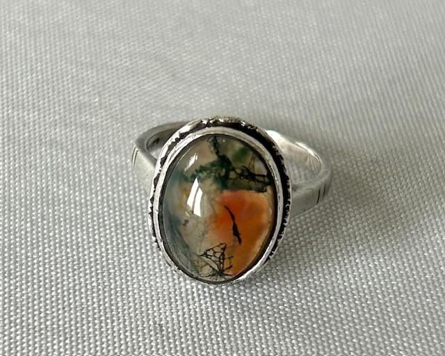 A delightful and petite silver ring, dating from the Art Deco period. The ring has a stunning oval moss agate cabochon, in a bezel setting. Inside the band, the ring is marked silver and is size L