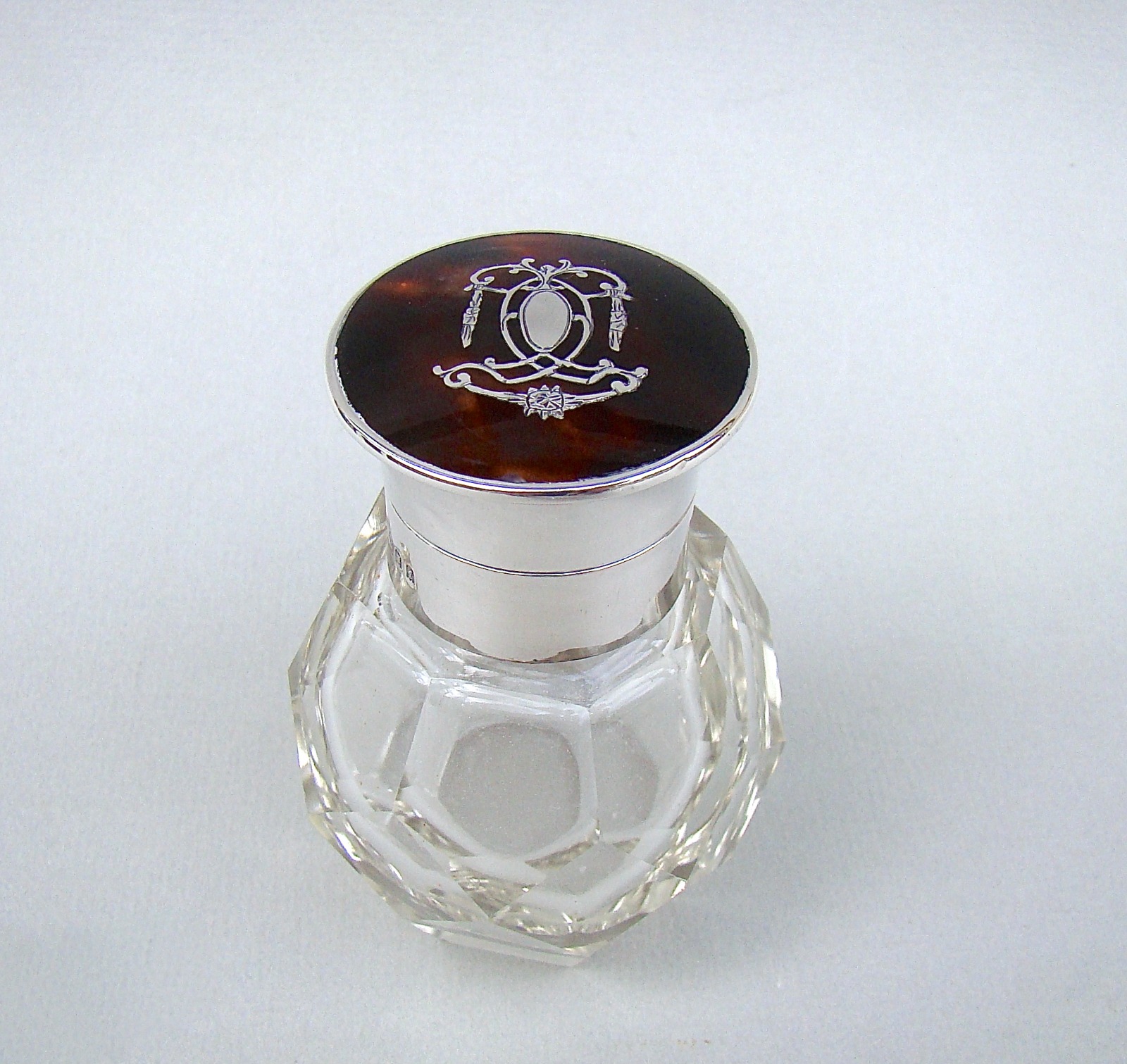 Art Deco Silver & Pique Tortoiseshell Etched Glass Scent Bottle by Collett & Anderson, London 1921
