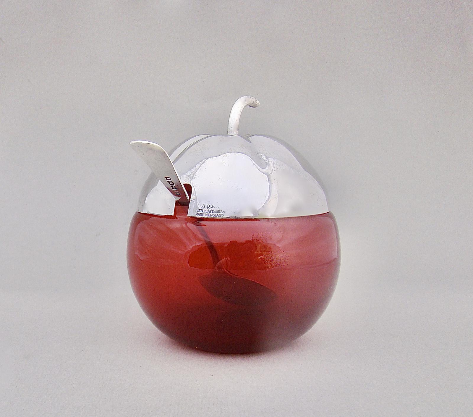 Art Deco Silver Plated Ruby Glass Apple-shaped Preserve Jar with Silver Preserve Spoon, Sheffield 1928