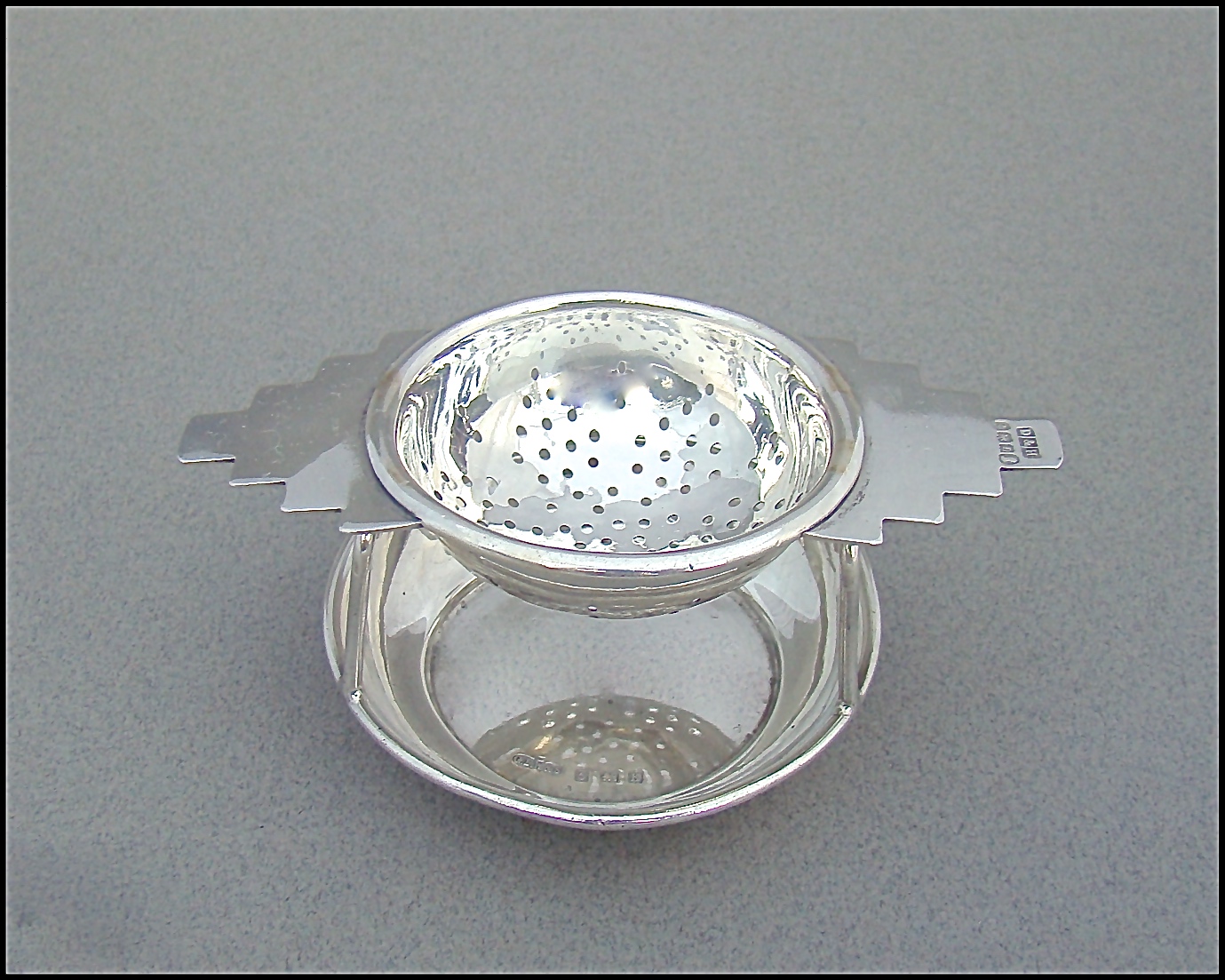 Art Deco Silver Tea Strainer by Deykin & Harrison with Associated Stand, Birmingham 1935