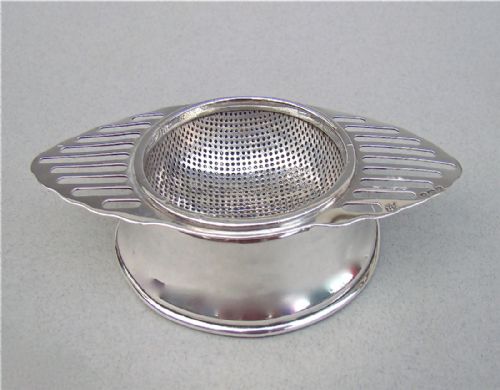 Art Deco Silver Tea Strainer & Stand by W J Myatt & Co, Birmingham 1932