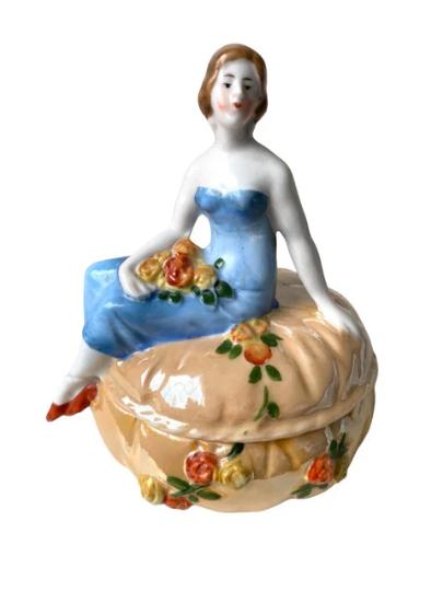 Art Deco Sitzendorf German Porcelain Lustre Glaze Flapper Lady Dressing Table Trinket / Powder Pot Box Circa 1920