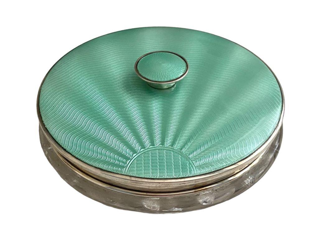Art Deco Solid Silver & Guilloche Enamel Lidded Cut Glass Powder Pot / Vanity Jar Birmingham 1934