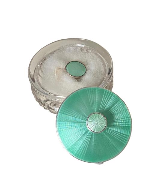Art Deco Solid Silver & Guilloche Enamel Lidded Cut Glass Vanity Jar Powder with Swans Down Puff