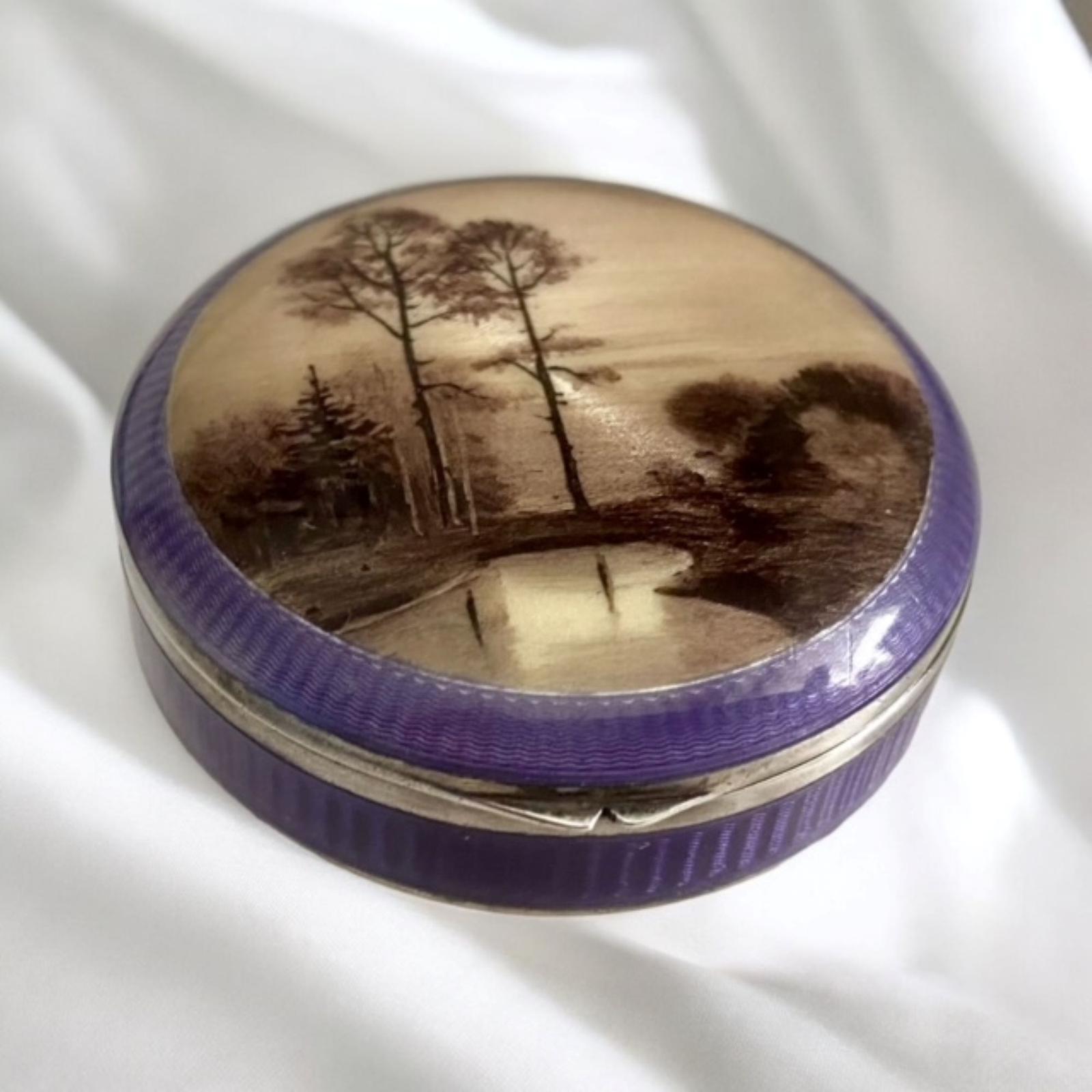 Art Deco Solid Silver Lilac Guilloche Enamel Scenic Powder Compact London Import 1921 Cohen & Charles