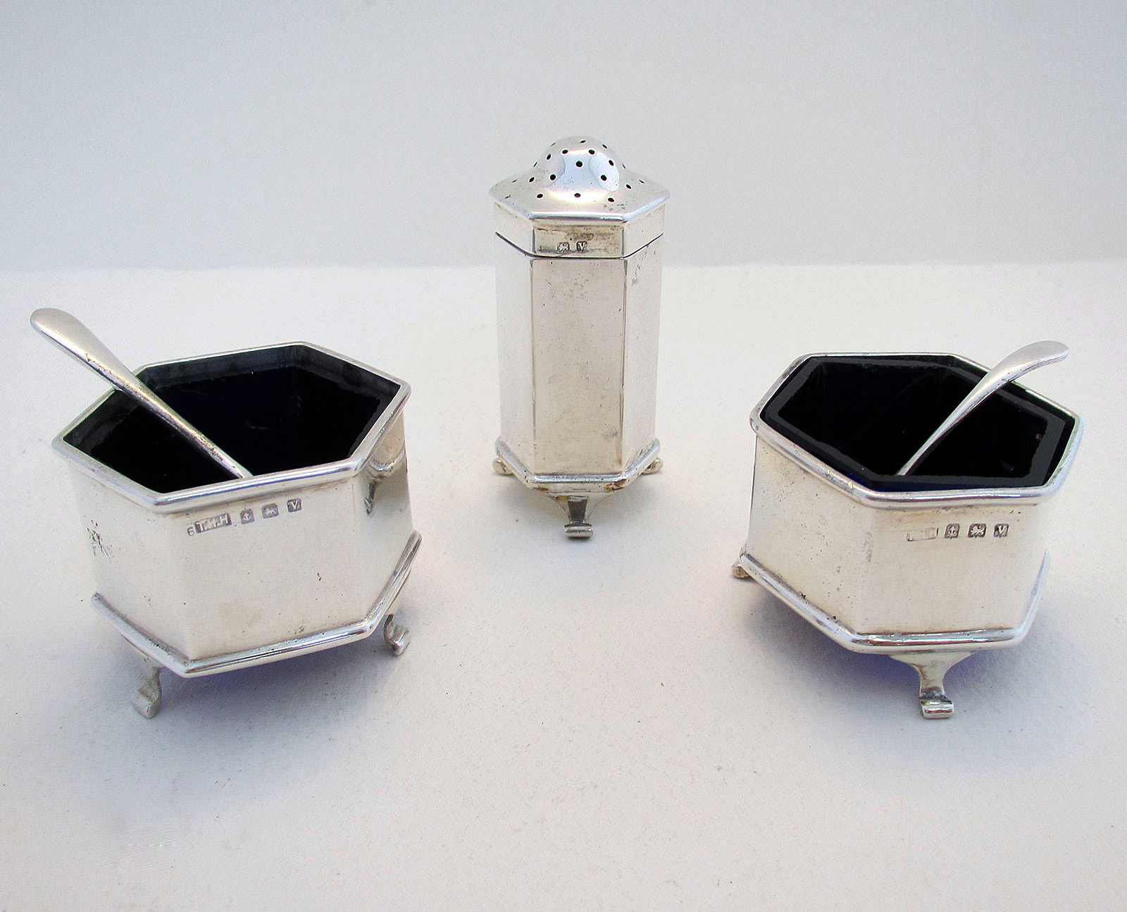 Art Deco Solid Sterling Silver Salt & Pepper Pot Bowl Cellar Shaker. 3-Piece Cruet with Spoons. Birmingham English Hallmarked