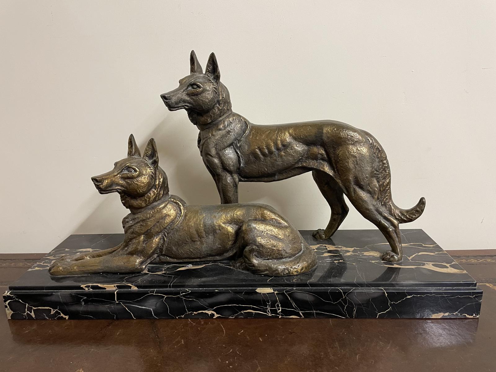 Art Deco Spelter German Shepherd Dogs On Marble Base