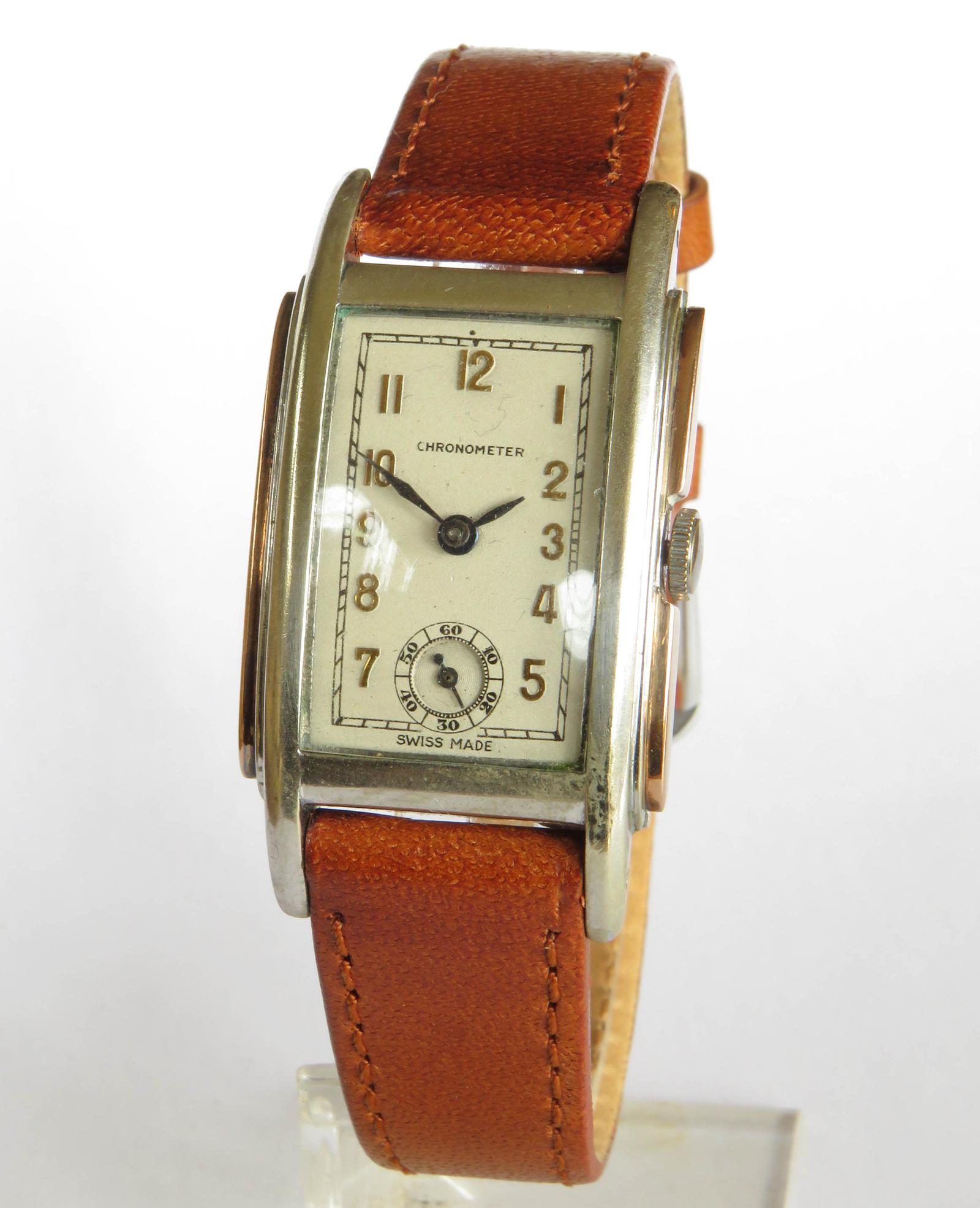 Art Deco Stainless Steel & Rose Gold Curvex Chronometer Wrist Watch