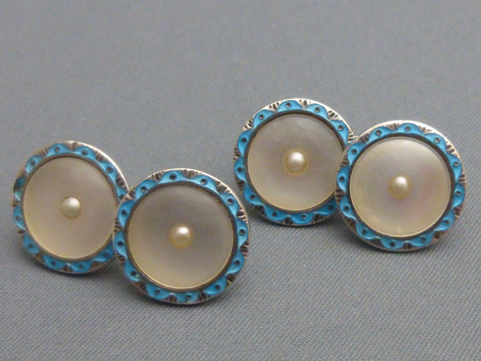 Art Deco Sterling Silver, Blue Enamel, Mother of Pearl & Faux Pearl Cufflinks
