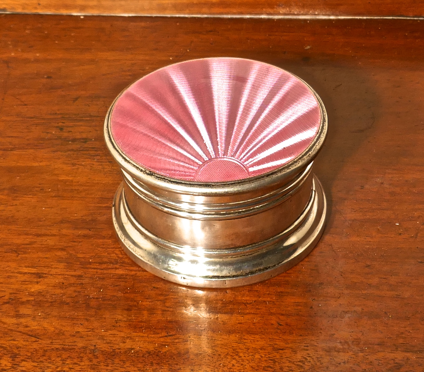 Art Deco Sterling Silver & Pink Guilloché Enamel Fan or Sunburst Lady’s Dressing Table Powder Compact