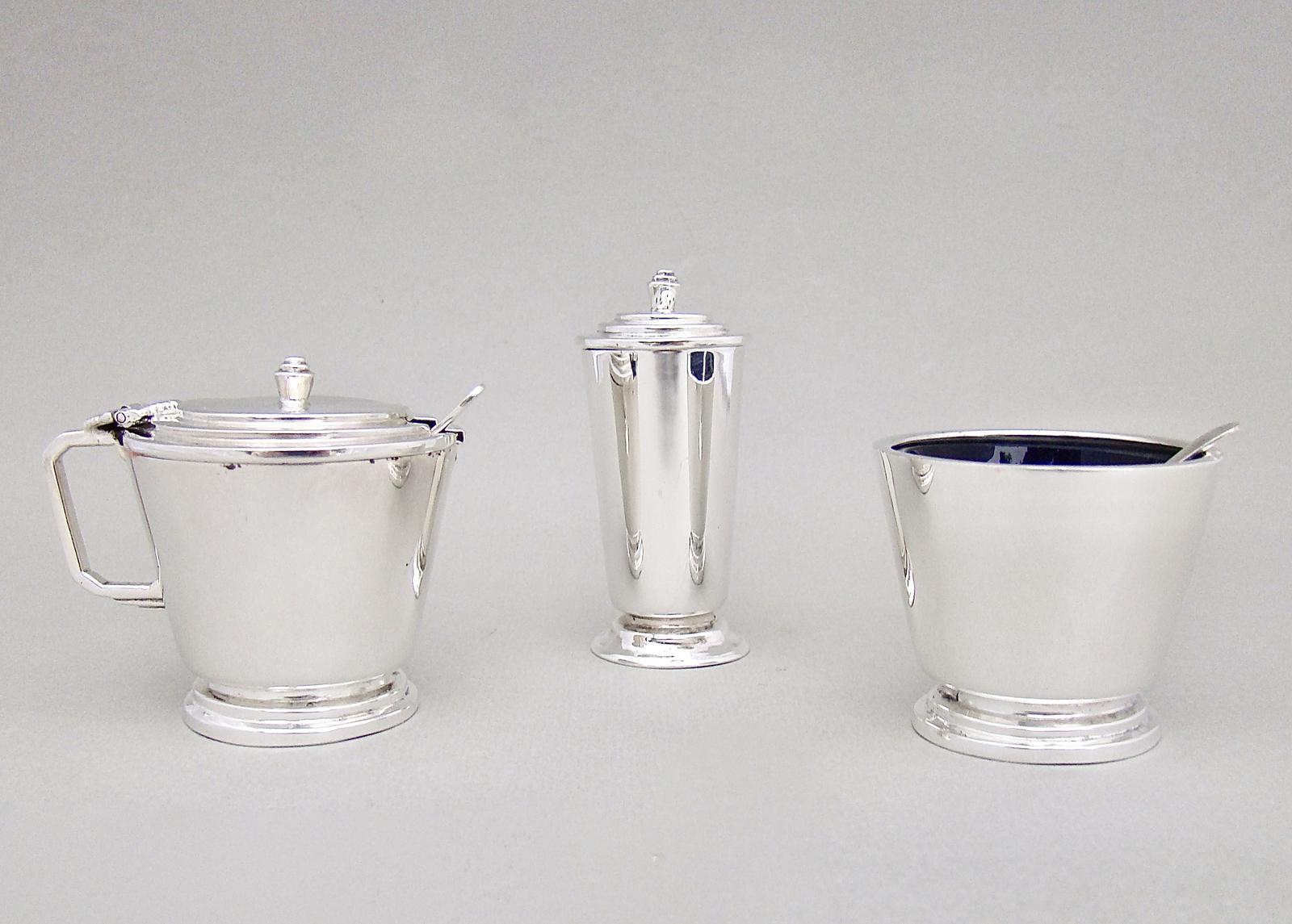Art Deco Sterling Silver Three Piece Condiment Set by Reid & Son, Birmingham 1934