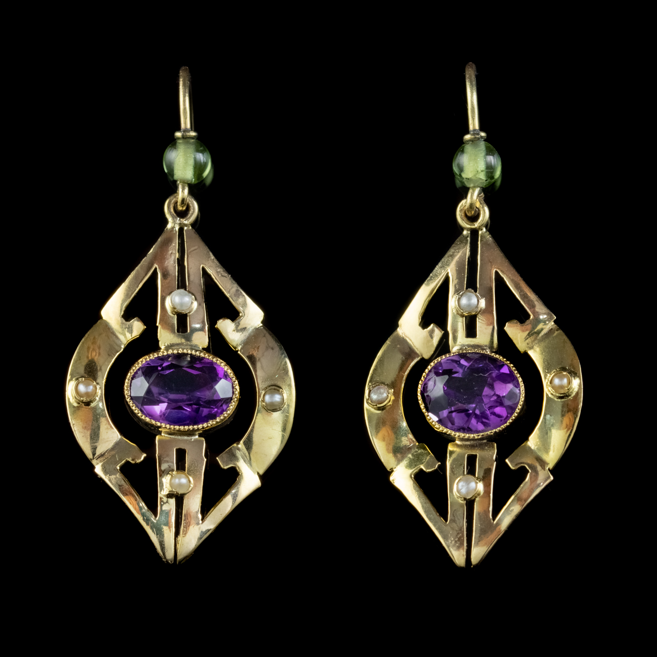 Art Deco Suffragette Amethyst Drop Earrings 9ct Gold c.1920