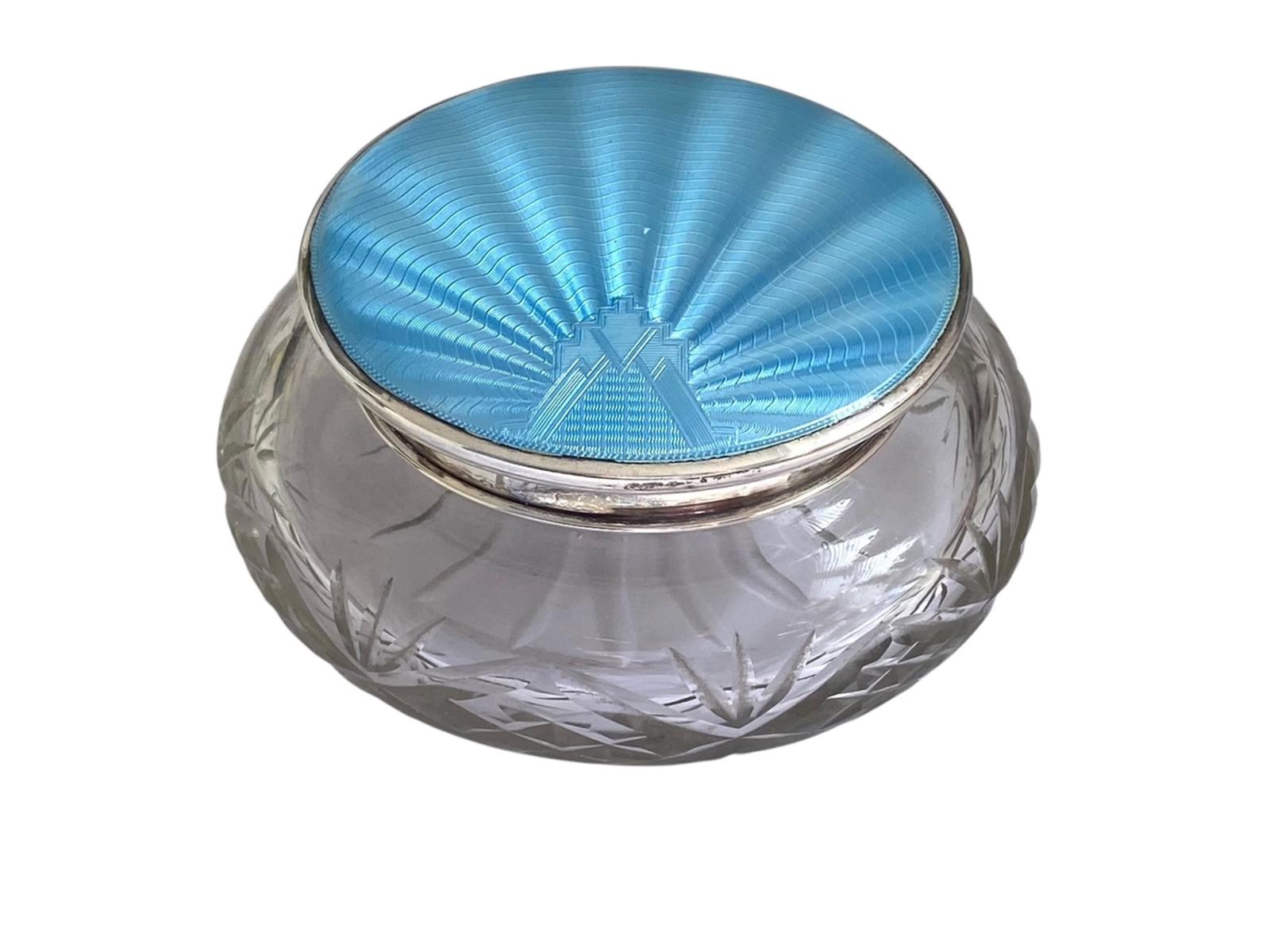 Art Deco Vanity Jar Powder Pot Cut Glass Solid Silver Guilloche Enamel Lid Birmingham 1938