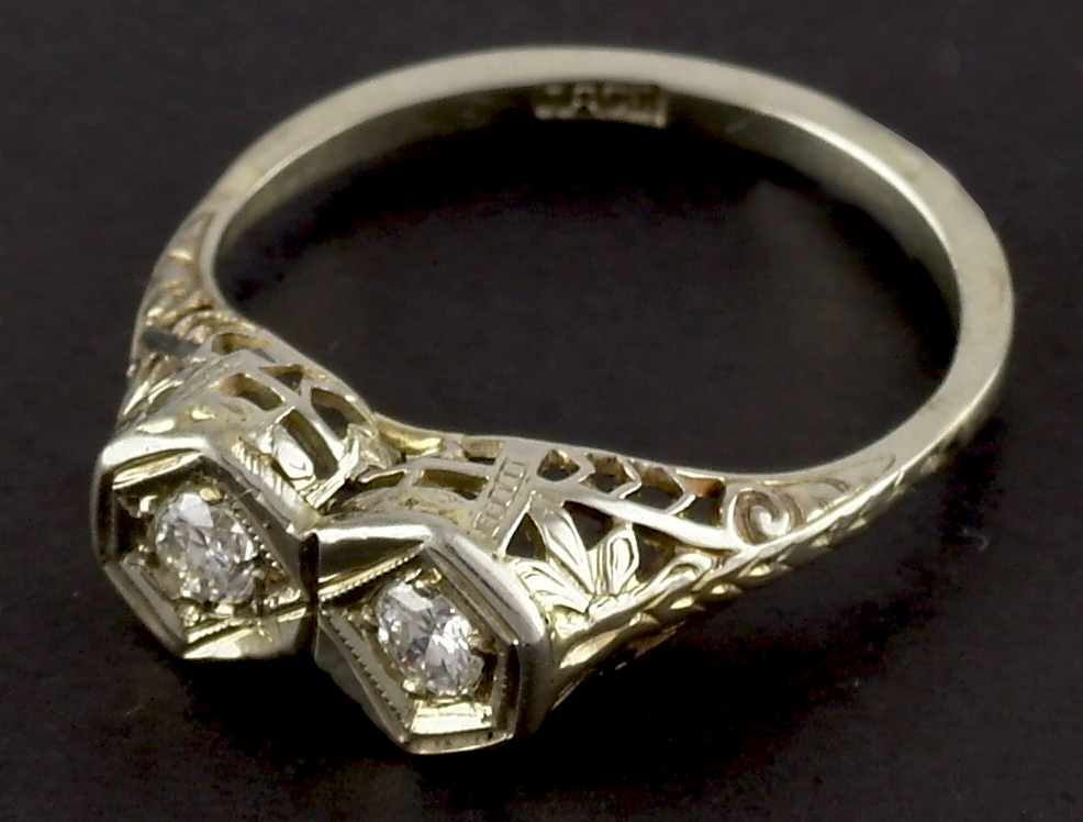 Art Deco White Gold Diamond Ring Unusual two stone setting