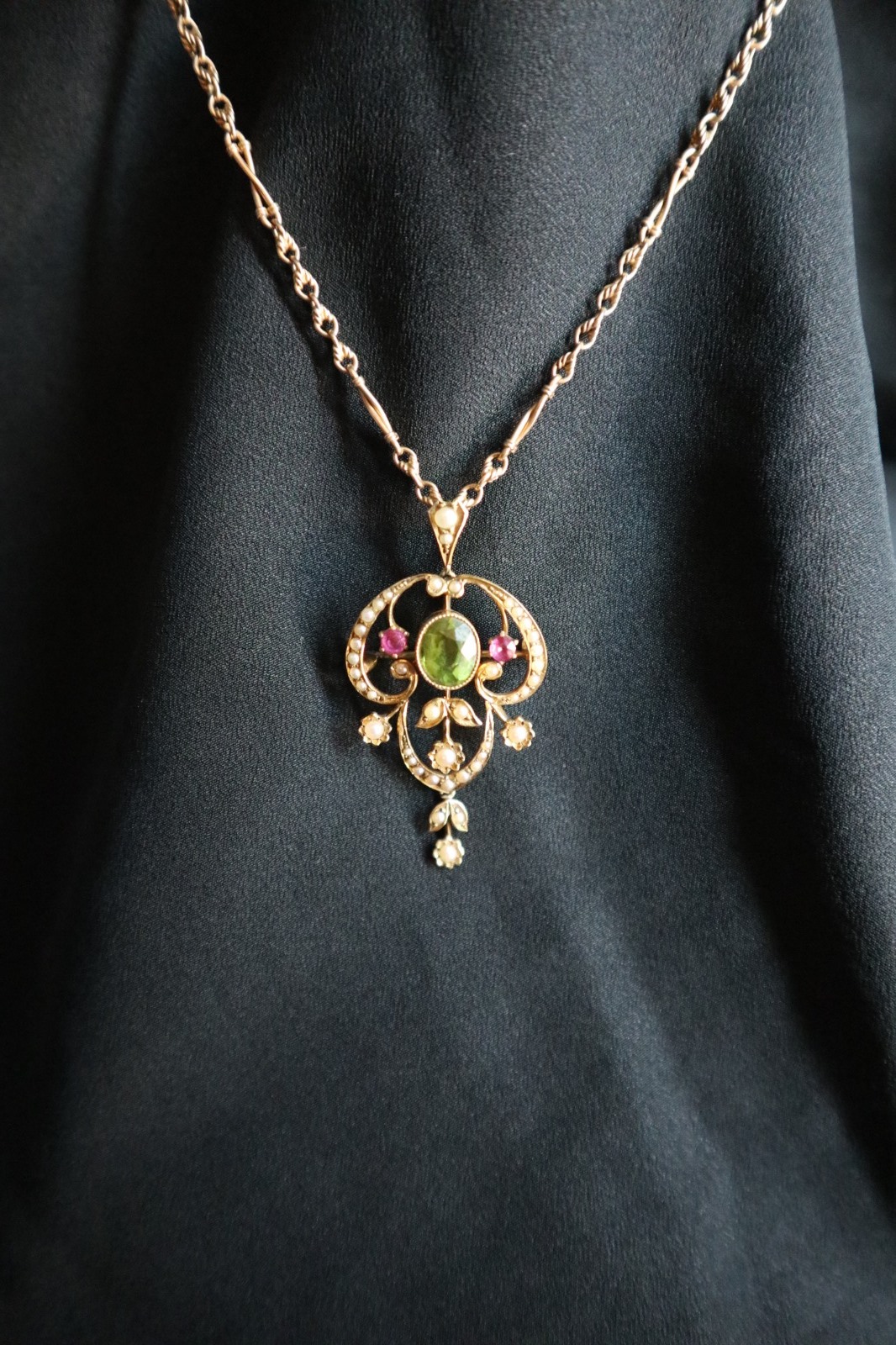 Art Nouveau, 15ct Gold, Peridot, Ruby & Seed Pearl Pendant (Combination Brooch) with 15ct Elaborate Naturalistic Ropework Chain, Suffragette Colours (1 of 28)