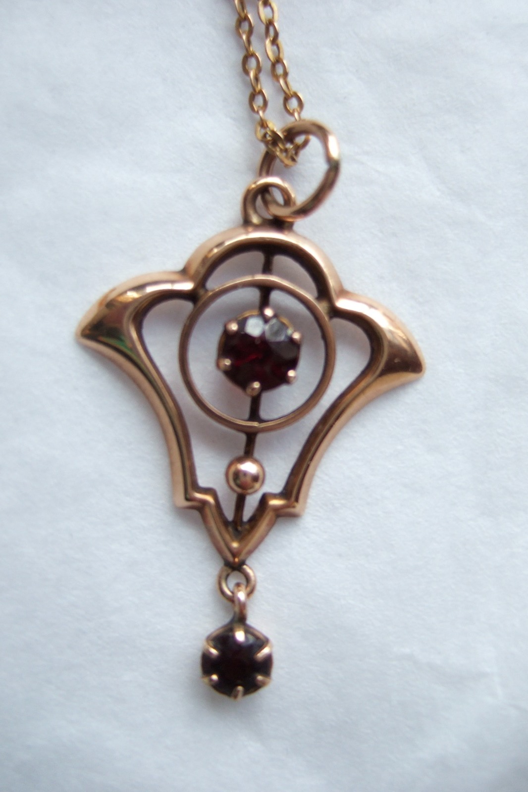Art Nouveau 9ct Gold Pendant & Fine Chain with Central Garnet & Garnet Drop (1 of 1)