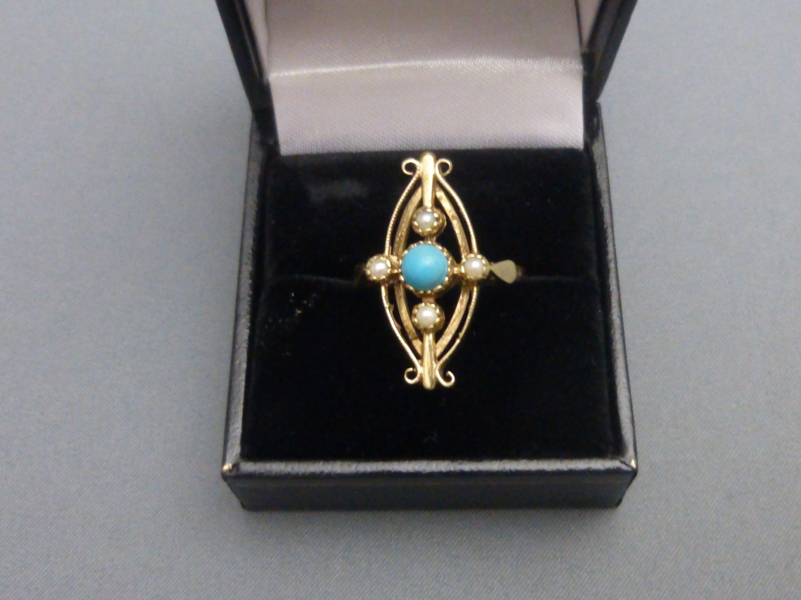 Art Nouveau 9ct Gold, Turquoise & Pearl Ring