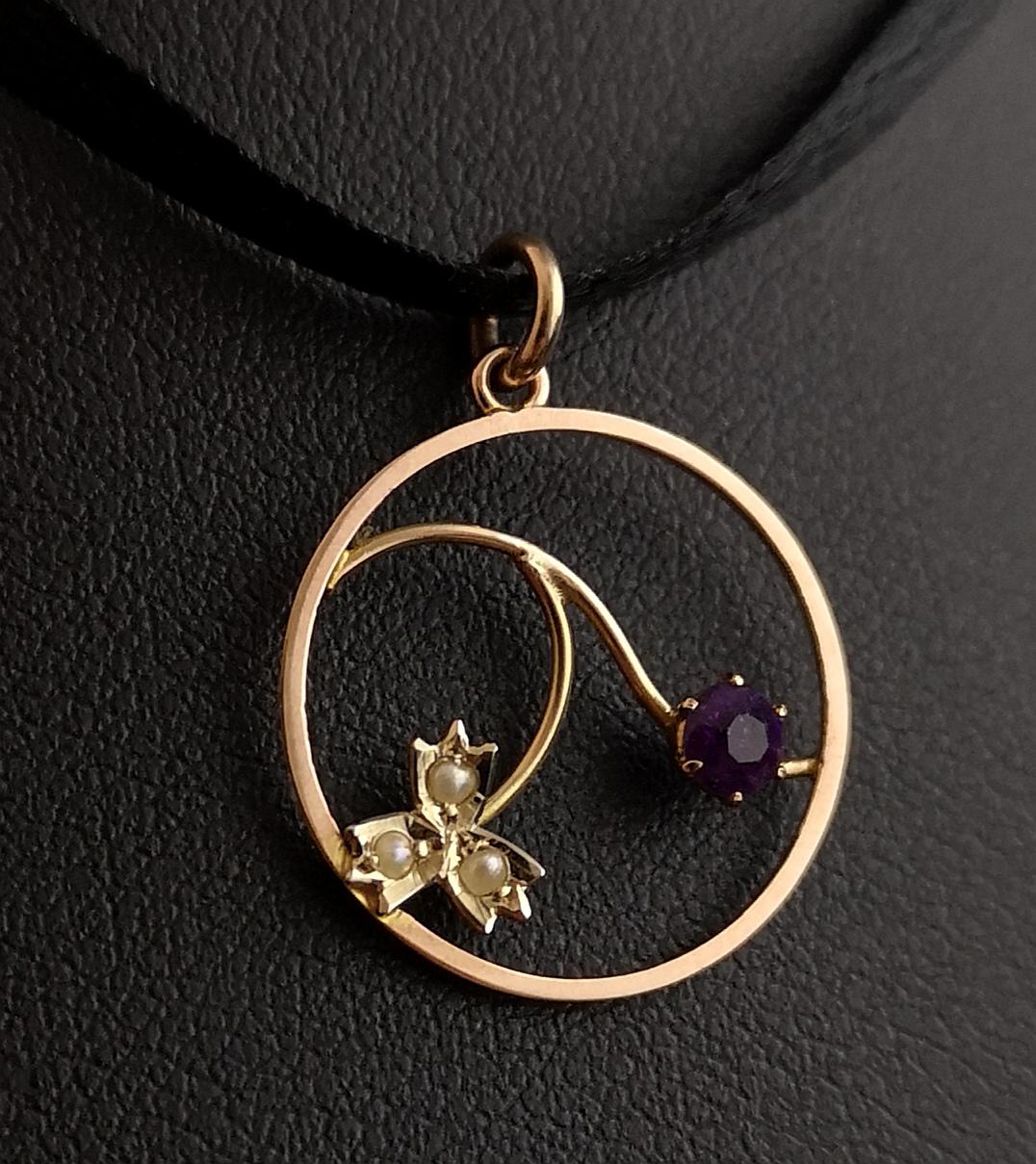 Art Nouveau 9ct Rose Gold Pendant, Amethyst & Seed Pearl