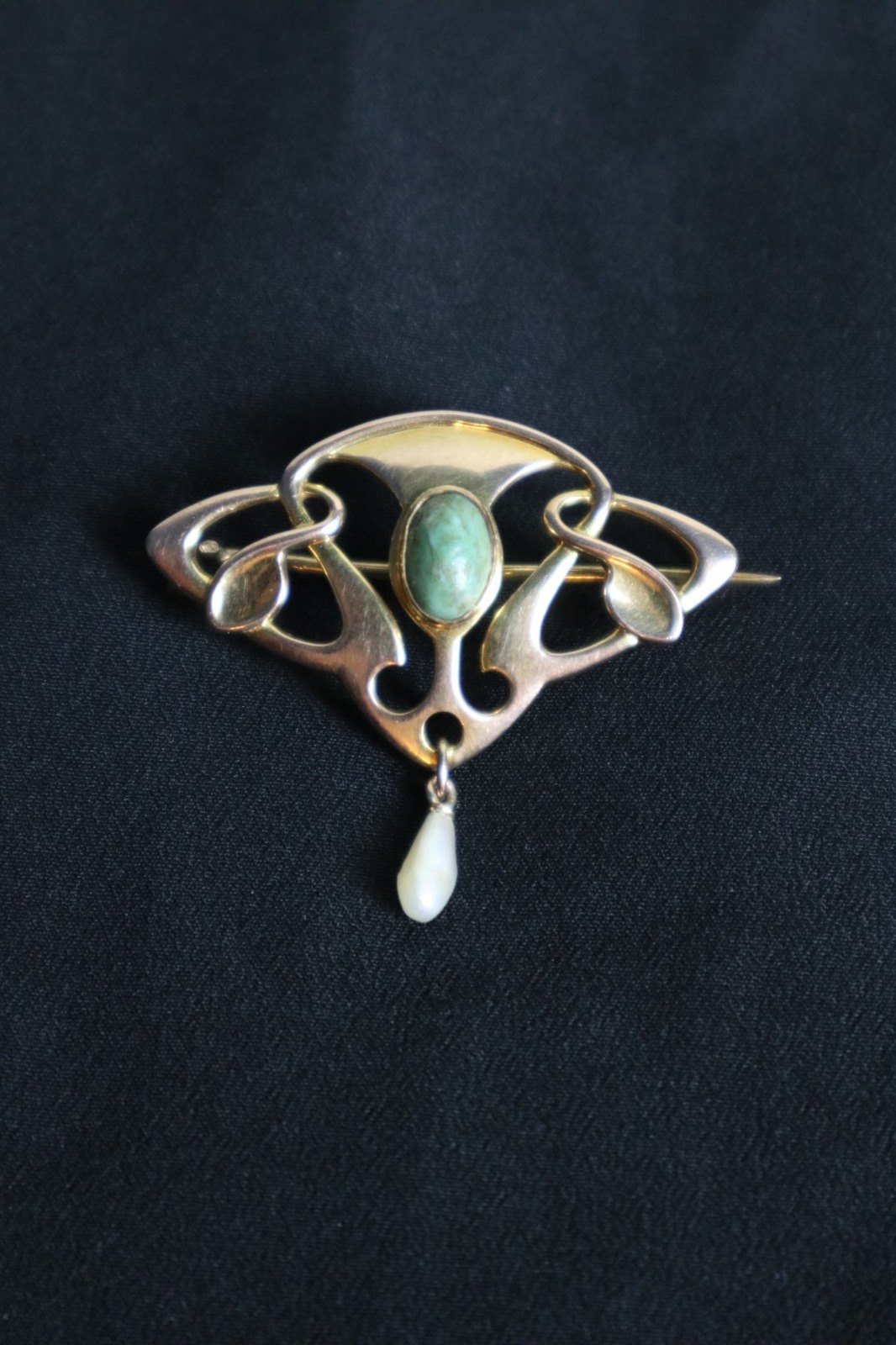 Art Nouveau - Barnet Henry Joseph, 9ct Gold & Turquoise Whiplash Brooch 'Supplier To Liberty & Co' circa 1890. (1 of 14)