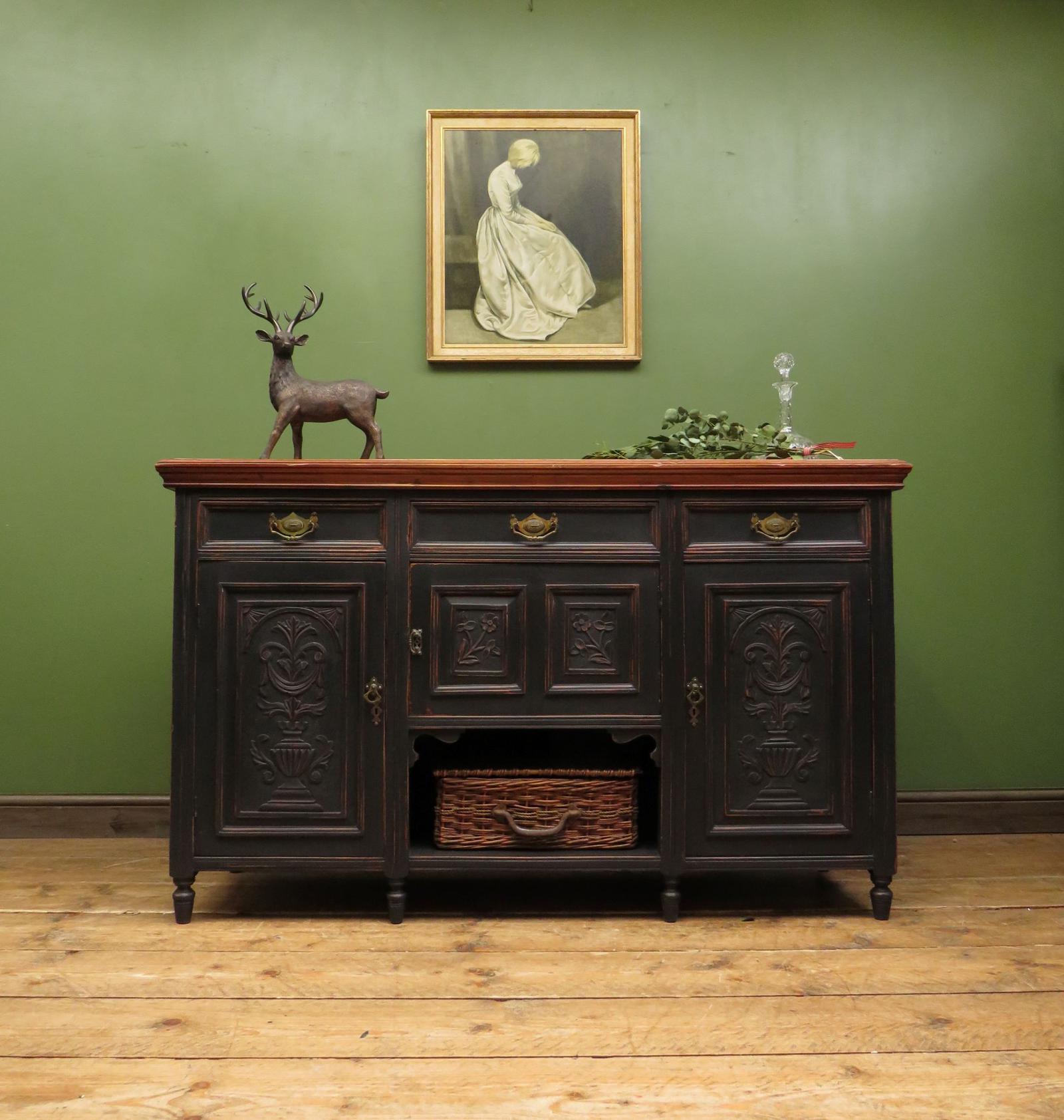 Art Nouveau Black Painted Sideboard with Open Hutch, Gothic Shabby Chic